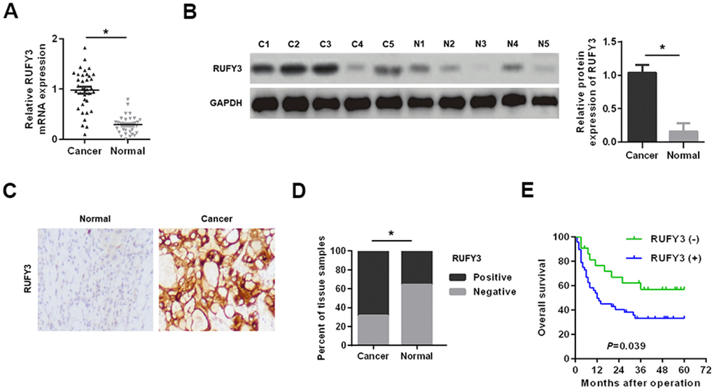 As shown in Figure 1A, 1B, in 35 pairs of cases, the RUFY3 mRNA and protein levels in cancer tissues were significantly higher than those in adjacent normal tissues. Consistently, the IHC analysis of RUFY3 expression in all cases further demonstrated the similar outcome (Figure 1C, 1D).
