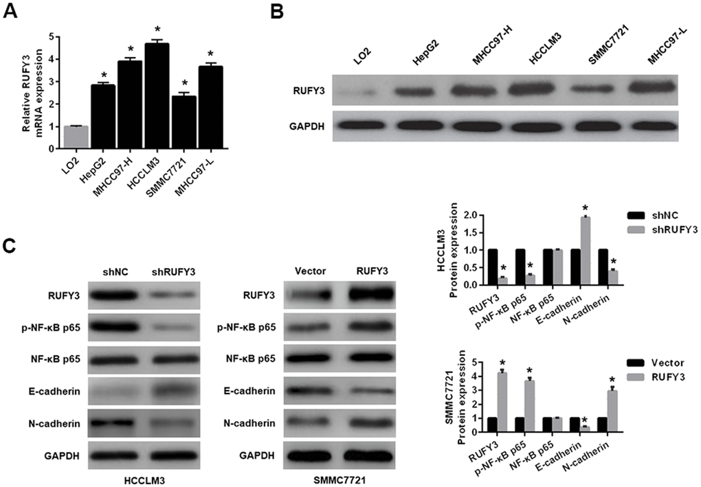Second, regarding to the effect of RUFY3 alteration on EMT in HCC cells, we demonstrated that RUFY3 knockdown in HCCLM3 cell decreased the expression levels of p-NF-κB p65 and N-cadherin, and increased the expression level of E-cadherin. Conversely, RUFY3 overexpression in SMMC7721 cell led to the opposite outcome (Figure 2C).
