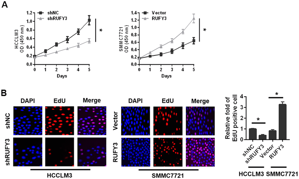 As shown in Figure 3A, the proliferation of HCCLM3 cell transfected with shRUFY3 was observably lower than shNC cell. Conversely, RUFY3 overexpression in SMMC7721 cell resulted in the opposite outcomes (Figure 3A). Likewise, we further found that RUFY3 promoted the growth of HCC cell by EdU incorporation (Figure 3B).