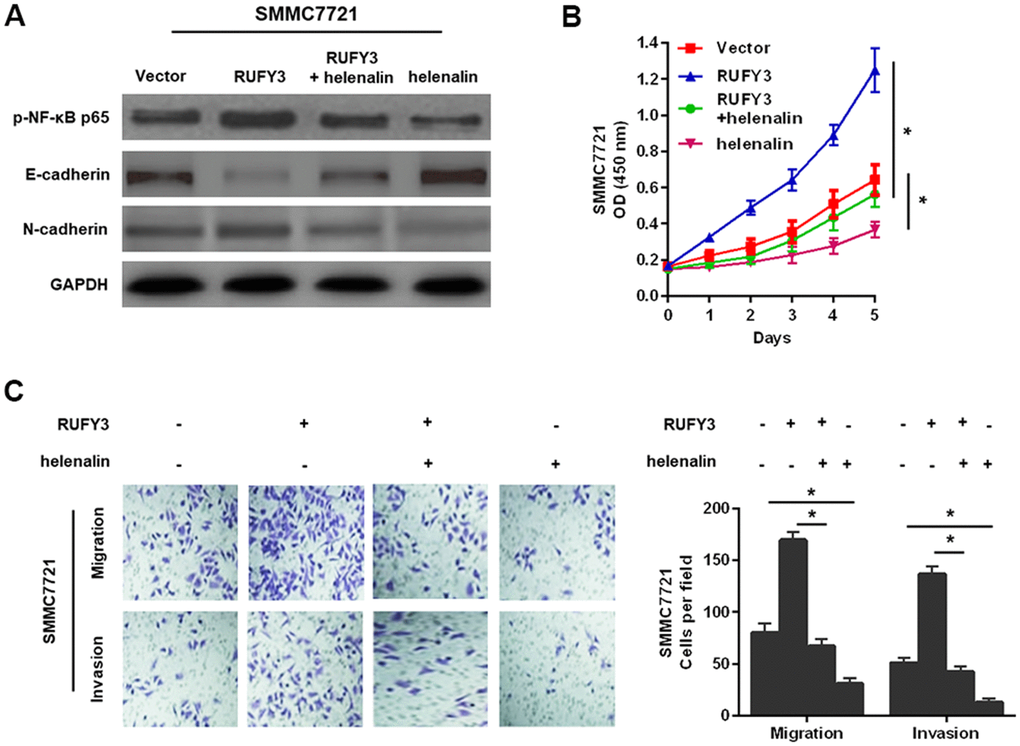Given that the NF-κB signaling is involved in the growth, migration and invasion of various malignant tumor cells [11], we hypothesized that RUFY3 might promote these changes through activating NF-κB signaling pathway in HCC. To test the hypothesis, the specific NF-κB signaling inhibitor, helenalin [12], was used to perform studies more deeply involving modified HCC cells, based on the above-mentioned conclusion that RUFY3 promoted EMT in HCC cells. It was worth noting that the results of this study suggested that treatment with helenalin led to a significantly decreased expression of p-NF-κB p65 and a distinct reversal of RUFY3-induced EMT (Figure 6A) and markedly suppressed RUFY3-induced cell growth (Figure 6B), migration and invasion (Figure 6C). Collectively, these results indicated that NF-κB signaling-induced EMT was responsible for RUFY3-facilitated HCC cell growth, migration and invasion.