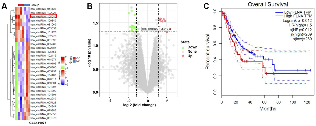 We identified dysregulated circRNAs in GC tissues using the GSE141977 dataset (Figure 1A, 1B). The association between the host genes of these dysregulated circRNAs and the survival rate of patients with GC was analyzed. FLNA, the host gene of hsa_circ_0091994 (circ_105040), was negatively correlated to the survival rate of patients with GC (Figure 1C).