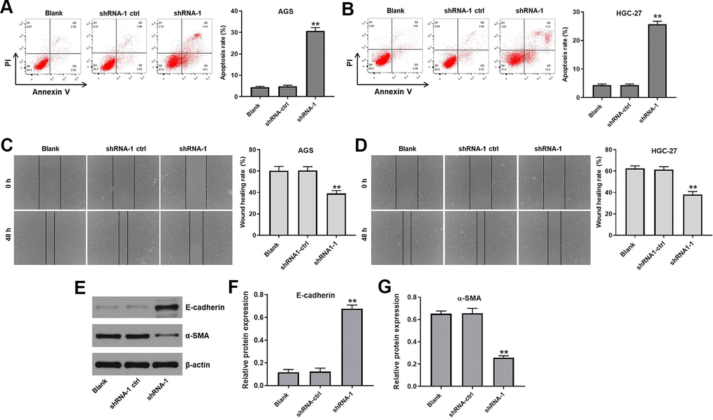 We used Annexin V and PI double staining to assess the effect of hsa_circ_0091994 knockdown on GC cell apoptosis. Compared with shRNA-ctrl group, shRNA-1 stimulated apoptosis in gastric cancer cells (Figure 3A, 3B and Supplementary Figure 1D). In addition, the wound healing activity of AGS and HGC-27 cells were inhibited by hsa_circ_0091994 shRNA-1 (Figure 3C, 3D). Meanwhile, the expression of EMT associated makers in AGS cells was detected with western blot. The result indicated hsa_circ_0091994 knockdown increased the level of E-cadherin and decreased the level of α-SMA (Figure 3E–3G). Taken together, hsa_circ_0091994 knockdown induced apoptosis and inhibited wound healing activity in AGS and HGC-27 cells.