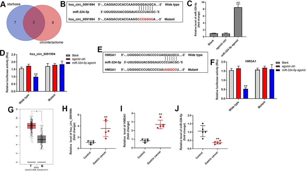 Hsa_circ_0091994 knockdown inhibited GC progression by suppressing the miR-324-5p/HMGA1 axis, which suggests hsa_circ_0091994 might serve as a novel therapeutic target for the treatment of GC.