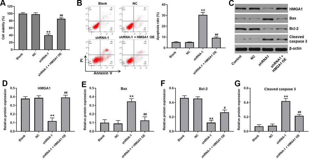Rescue experiments were performed to verify the function of hsa_circ_0091994 in GC cells. Since hsa_circ_0091994 knockdown inhibited GC cell proliferation via suppressing the miR-324-5p/HMGA1 axis, HMGA1 overexpression (OE) and shRNA-1 vectors were co-transfected into AGS cells. HMGA1 OE reversed the decrease in cell viability that was induced by shRNA-1 (Figure 5A). Similarly, HMGA1 OE reversed the increase in apoptosis that was induced by shRNA-1 (Figure 5B). Protein expression of HMGA1, Bax, Bcl-2, and cleaved caspase-3 was examined by western blot (Figure 5C). The shRNA-1 decreased HMGA1 and Bcl-2 expression, and increased Bax and cleaved caspase 3 levels (Figure 5D–5G). However, HMGA1 OE reversed all of these effects (Figure 5C–5G).
