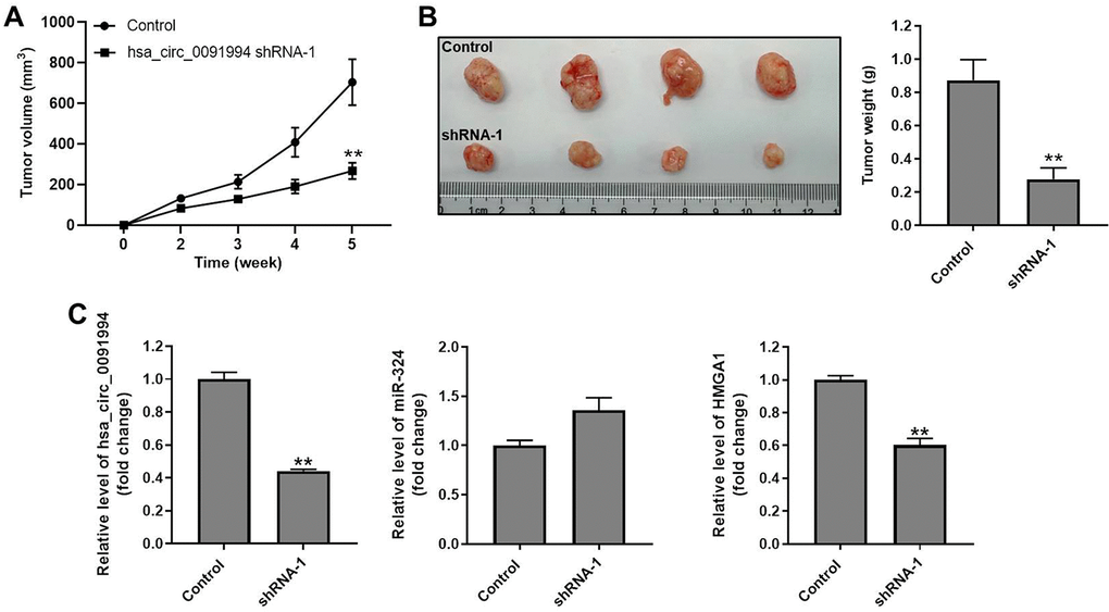 Finally, the role of hsa_circ_0091994 was explored using with a mouse xenograft model. Tumor growth was suppressed by hsa_circ_0091994 knockdown at 5 weeks (Figure 6A). Tumor tissue was harvested and weighed right after sacrifice. Tumors in the shRNA-1 group were smaller than those in the control group (Figure 6B). In addition, the levels of hsa_circ_0091994 and HMGA1 in the shRNA-1 group were notably downregulated, while miR-324-5p level was slightly upregulated (Figure 6C). These data indicated hsa_circ_0091994 knockdown inhibited GC tumor growth in vivo.