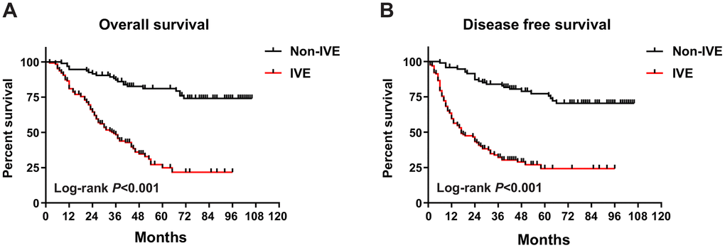 To assess the prognostic significance of some clinicopathological characteristics and IVE in patients with stage III CRC in cohort 1, univariate and multivariate analyses were applied. In univariate analysis, the results revealed that IVE, lymph node metastasis, tumor location, histologic type, obstruction, and serum CA199 levels were associated with both OS and DFS (P < 0.05). On the other hand, gross tumor morphology was only related to OS (P = 0.026) but not DFS (P = 0.078) (Table 1). All factors mentioned above, as well as the tumor invasion depth (P < 0.1), were included in the multivariate analysis, which suggests IVE was statistically significant for both OS (HR: 4.486, 95%CI: 2.638-7.631; P < 0.001) and DFS (HR: 4.949, 95%CI: 2.996-8.174; P < 0.001), as well as lymph node metastasis and tumor location (Table 2). Of the 220 patients, 113 developed tumor recurrence (non-IVE group, 24 versus IVE group, 89) and 103 had cancer-related deaths (non-IVE group, 21 versus IVE group, 82). Kaplan-Meier analysis and log-rank tests were applied to assess for differences in OS and DFS between groups characterized by IVE presence or not. It showed patients with IVE had a worse outcome after surgery and median OS and DFS of stage III CRC patients with IVE were 35 and 17 months, respectively. (Figure 1A, 1B).