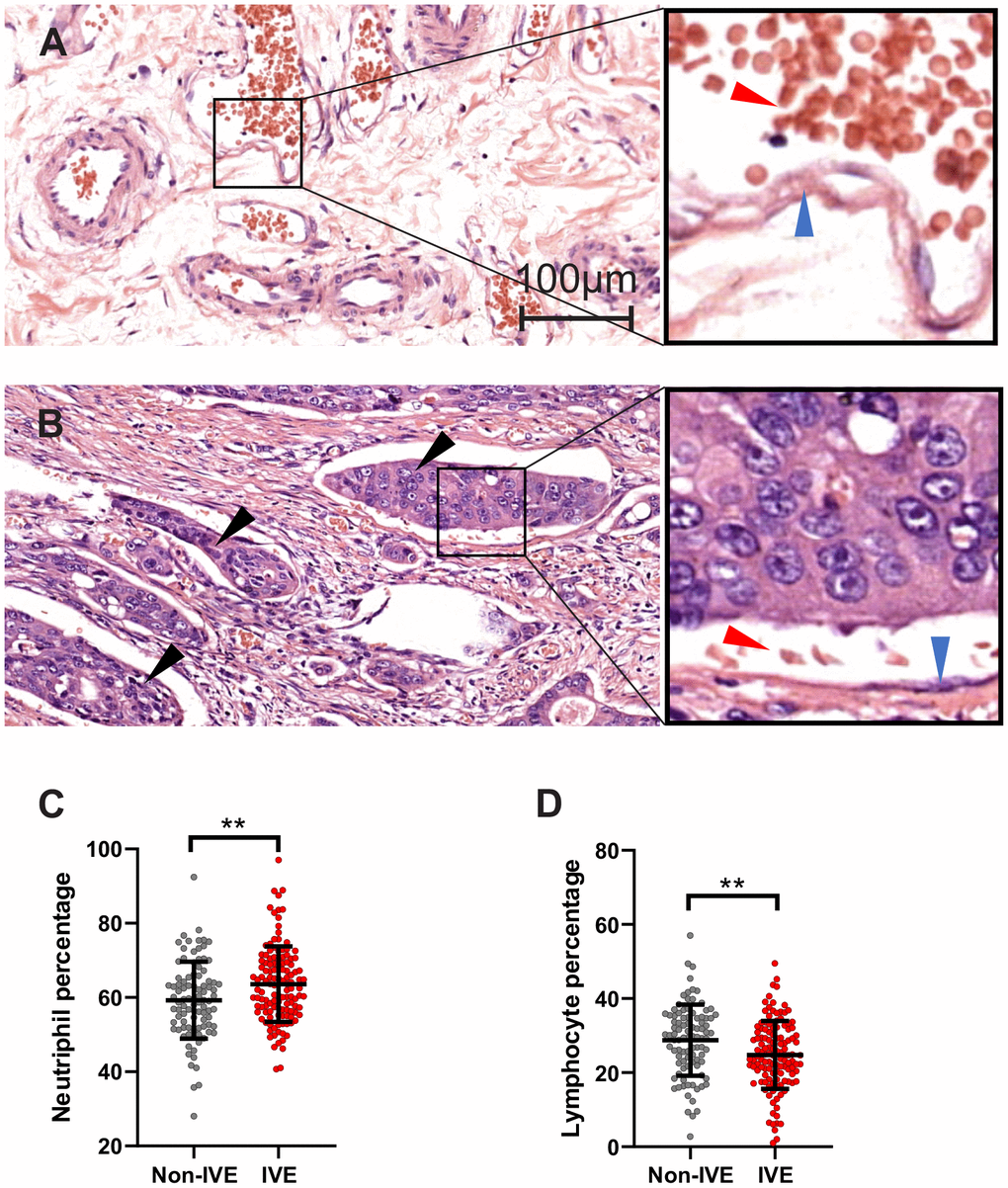 In cohort 1, IVE was observed in 126 (57.3%) specimens (Figure 2A, 2B). Our analysis revealed that IVE was associated with lymph node metastasis (P < 0.001), tumor histologic type (P < 0.001) and pre-operation obstruction symptom (P = 0.008) (Supplementary Table 2). Importantly, patients with IVE had a higher neutrophil percentage (non-IVE group, 59.26 ± 10.38 versus IVE group, 63.38 ± 10.17; P = 0.002) and lower lymphocyte percentage (non-IVE group, 28.77 ± 9.62 versus IVE group, 24.80 ± 9.19; P = 0.002) (Figure 2C, 2D and Supplementary Table 3). Additionally, serum creatinine, a marker for renal function assessment, was higher in the IVE group (P = 0.008) (Supplementary Table 3).