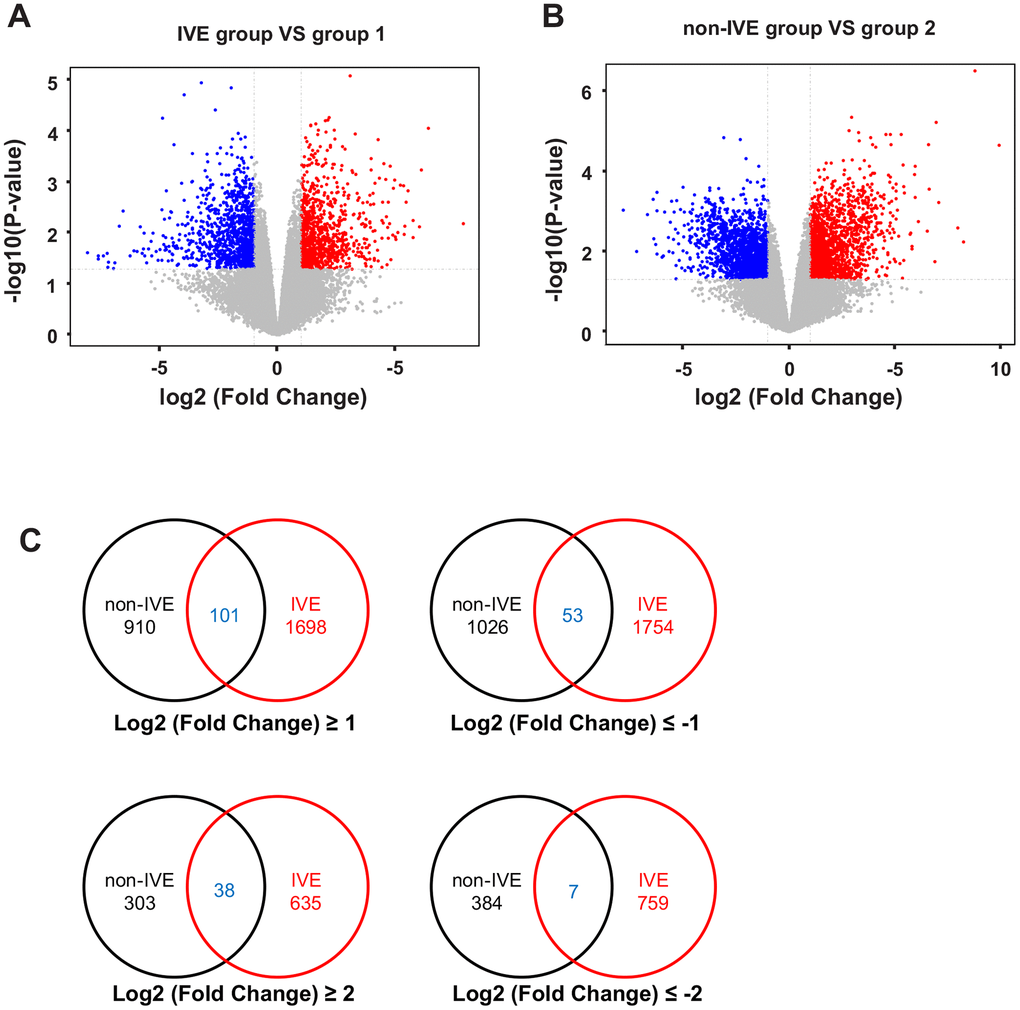 A total of 12 samples from 6 patients (Supplementary Table 4) with stage III CRC were used for microarray analysis. These samples consisted of 6 fresh cancer tissues and their paired non-cancerous tissues. Compared with paired group 2, there were 1011 up-regulated genes and 1080 down-regulated genes with absolute fold change >2 and P < 0.05 in the non-IVE group (Figure 3A). Meanwhile, there were 1799 up-regulated genes and 1807 down-regulated genes with absolute fold change >2 and P < 0.05 in the IVE group compared with paired group 1 (Figure 3B). The number of DEGs in the IVE group was higher compared to the non-IVE group, however, only a small number of genes were shared by both groups (Figure 3C).