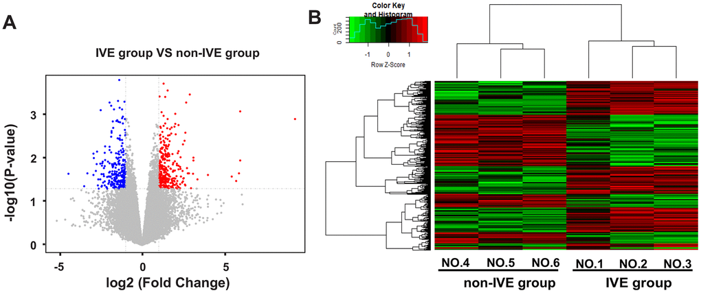 Next, the IVE group was compared with the non-IVE group. There were 670 genes with fold change > 2 (306 up-regulated and 264 down-regulated) and 93 genes with fold change > 4 (52 up-regulated and 41 down-regulated) compared with the non-IVE group (Figure 4A). The top ten up- and down-regulated genes were listed in Supplementary Table 5. DEGs clustering analysis was performed and it was revealed that the observed gene signatures distinguished IVE tumors from non-IVE tumors effectively (Figure 4B).