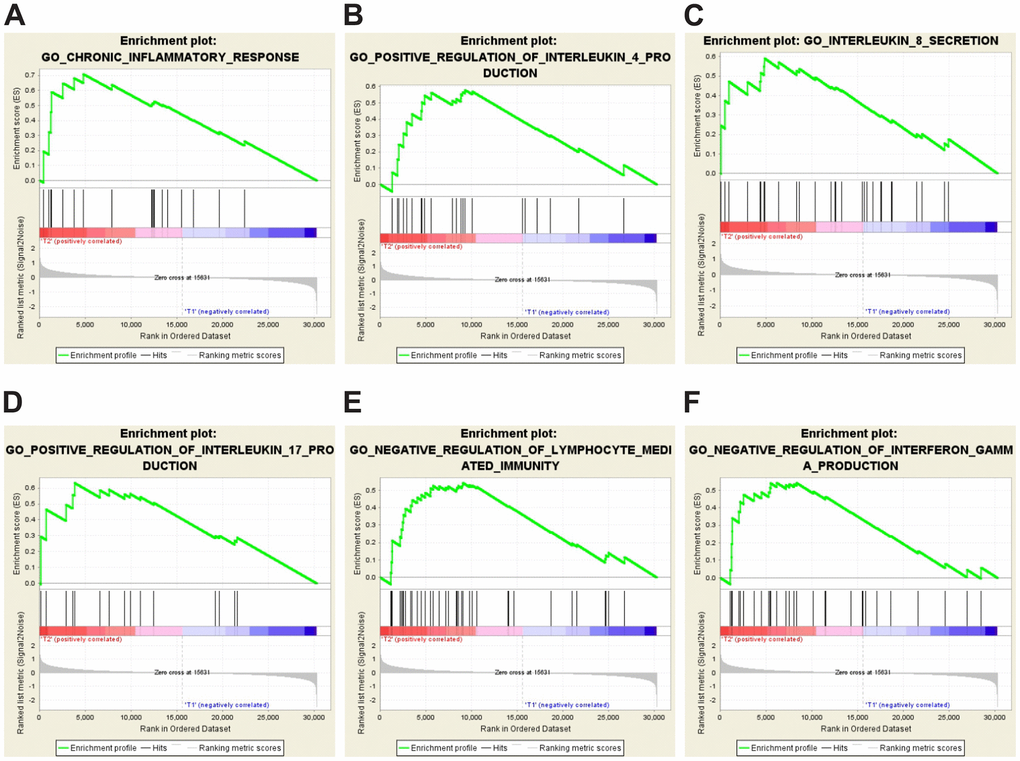 The results above (Figure 2 and Supplementary Table 3) suggest that inflammation and immune response may play a role in IVE development. To identify enriched genes that may be involved in immune response or inflammation, GSEA analysis was performed by using gene expression data and some prior defined gene sets. Our analysis revealed that the IVE group correlated with chronic inflammatory response positively and lymphocyte-mediated immunity negatively compared with the non-IVE group (Figure 5). Additionally, cytokine/chemokine production pathways were also analyzed between IVE and non-IVE group. Gene sets promoting the production of some interleukin (IL) including IL-4, IL-8, and IL-17 and negatively regulating interferon γ (IFNγ) production were enriched in the IVE group (Figure 5). Differential enrichment of those gene sets was not observed between the group 1 and group 2. Thus, the chronic inflammatory and immunosuppressive tumor microenvironment may promote IVE formation and CRC progression.