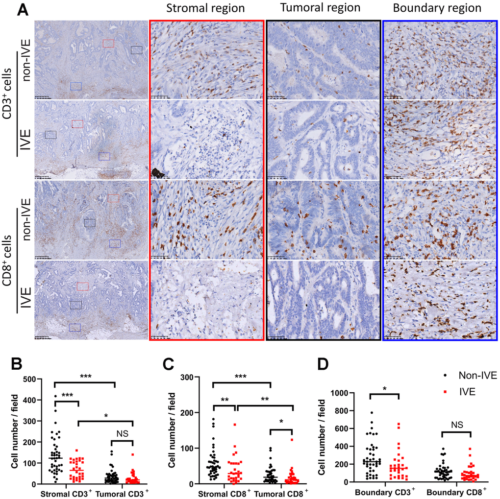 The density of TILs reflects the immune status in TME. We found TILs did not distribute equally in tumor areas including stromal region, tumor region, and boundary region (Figure 6). Compared to tumors without IVE, those with IVE had fewer CD3+ and CD8+ TILs in both stromal and tumoral regions, while fewer CD8+ TILs were detected in tumoral regions (Figure 6A–6C). Notably, TILs were more abundant in the stromal region compared with tumor region (Figure 6A–6C), which suggested a pivotal role for the stroma in immune-mediated cancer control. TILs accumulated prominently at the frontier of the tumor (Figure 6A), however, only a small difference of CD3+ TILs was observed between non-IVE and IVE tumors (Figure 6D).