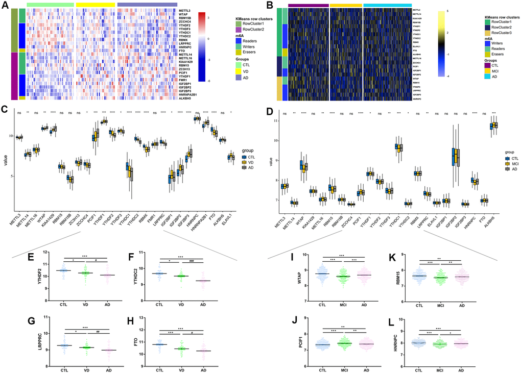 Alternations of RNA methylation modified genes in the central nervous system (CNS). Little evidence has elucidated the relationships between m6A regulators and neurodegeneration, such as dementia [32]. A recent study by Han et al. using APP/PS1 transgenic mice indicated that m6A abnormality (such as METTL3 and FTO genes) is closely related to AD [33]. To gain a thorough understanding regarding cognitive malfunction from a new perspective, we systematically investigated the molecular alterations of m6A regulators and their associations with AD, VD, and MCI using the database search.