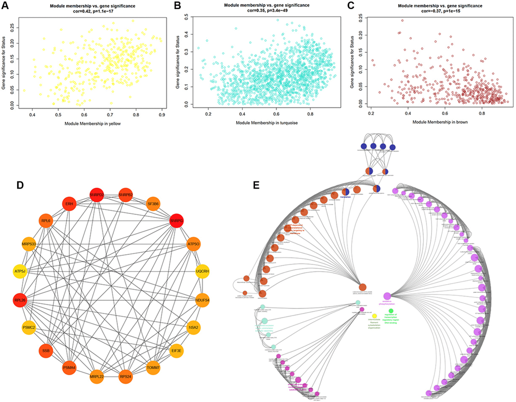A total of 1666 genes in module turquoise and the top20 hub genes, including SNRPG, SNRPD2, RPL26, ERH, SNRPB2, and SSB, were selected, setting GS >0.3 and module membership (MM) >0.8. We can tell that these genes were inseparably associated with each other (Figure 6D). Herein, GO enrichment analysis was performed to identify potential biological functions of module turquoise-related genes (Figure 6E). The result revealed that genes within the module turquoise were most significantly enriched in translation, peptide biosynthetic process, nuclear-transcribed mRNA catabolic process, mRNA/RNA catabolic process.