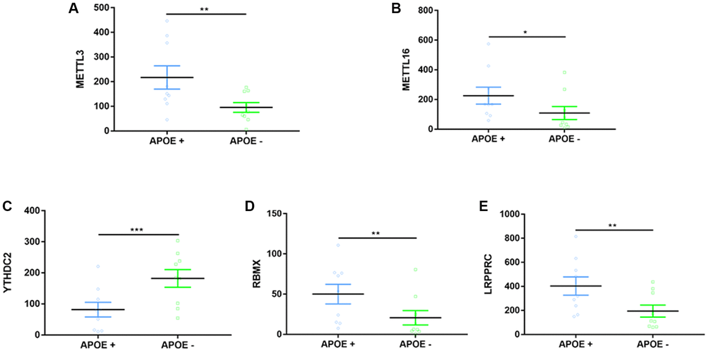 The association between apolipoprotein E (APOE) gene ɛ4 allele and m6A methylation regulators in AD patients was examined by extracting data from GSE29652. Eighteen post-mortem brain samples of AD were categorized into APOE ɛ4+ or APOE ɛ4− subtype. The expression levels of m6A regulators were compared between APOE ɛ4 genotype groups after data normalization and DEGs extraction.