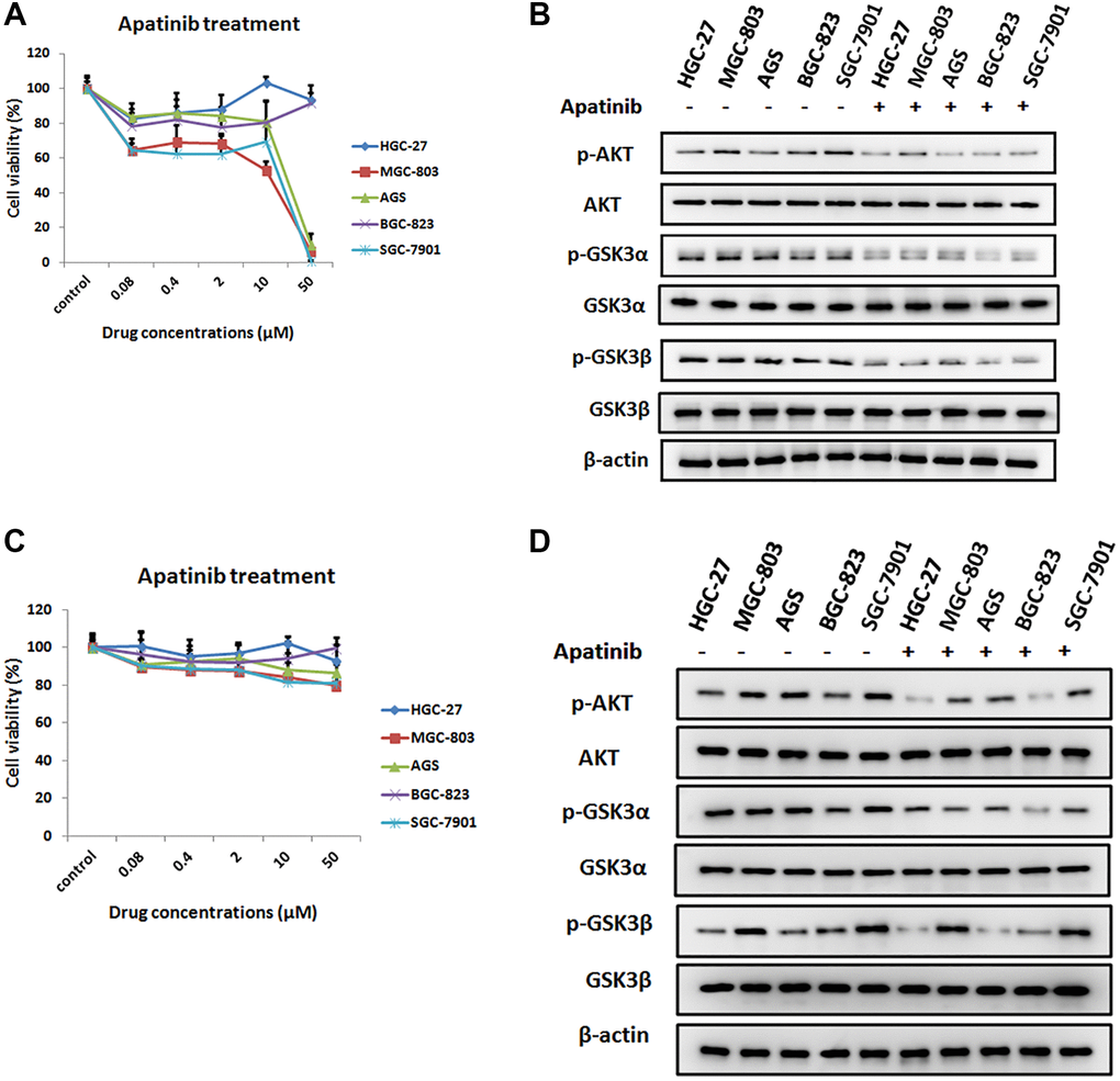 Previous research has found that AKT/GSK-3β/β-catenin signaling is crucial for the proliferation and invasion of gastric cancer cells [21]. To further elucidate the mechanism of the inhibition effect of apatinib, we detected the levels of AKT and GSK in different GC cell lines, which were pretreated with 2 μM apatinib for 72 hours. It was observed that apatinib could inhibit the phosphorylation of AKT, GSK-3α and GSK-3β in different GC cell lines to varying degrees, which could be due to induction of cell death (Figure 1B). The same result can be found after pretreatment with apatinib for 8 hours (Figure 1C, 1D). Thus, the finding suggested that apatinib may induce apoptosis through inhibition of the expression levels of p-AKT and p-GSK protein.