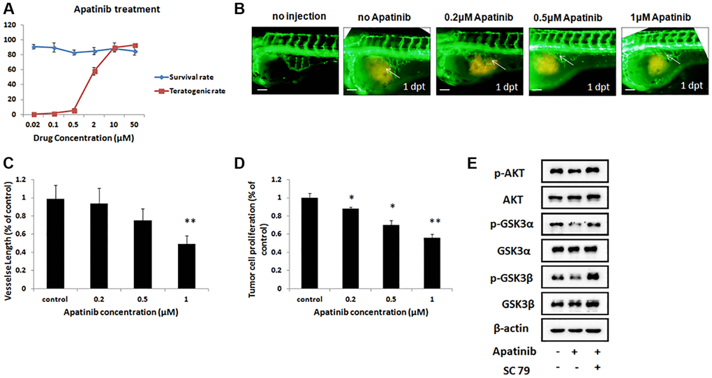 Apatinib, a highly selective tyrosine kinase inhibitor, has shown promising antitumor effects on malignant tumors. Here, we designed and established a GC zebrafish xenograft model for evaluation of clinical effects of apatinib in GC patients. In the present study, our data showed that apatinib inhibited tumor progression by negatively regulating the AKT/GSK3α/β pathway in GC. The PI3K/Akt signaling pathway plays an important role in a variety of tumors, including GC, and it is closely related to tumorigenesis, proliferation, invasion, apoptosis, and autophagy. We found that the newly formed vessel length in the gastric cancer and tumor growth in the groups that were treated by apatinib at several concentrations could be commonly considerably inhibited in a dose- and time- dependent manner when compared with the control group, which was shown in the previous study to act via inhibiting the AKT/GSK3α/β signaling pathway. This findings was consistent with previous studies on human colon cancer, osteosarcoma and thyroid cancer [22–24]. This positive result might be a hint for further researches related to the relationships between particular molecule-targeted drugs and precision medicine.