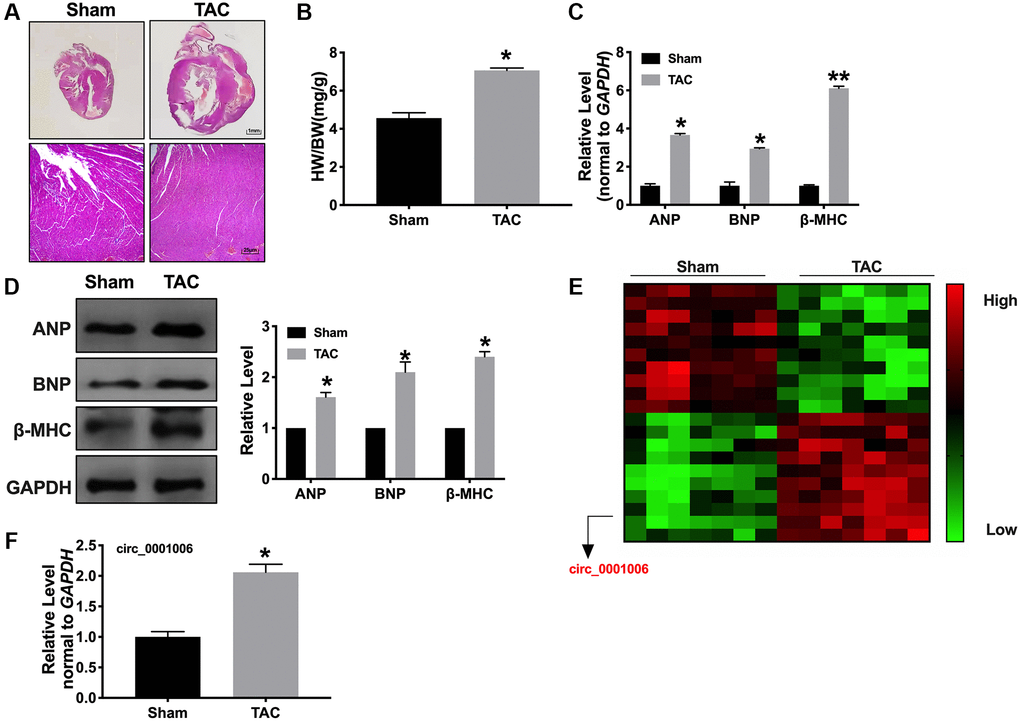 Firstly, the mice were randomly divided into two groups, including sham and TAC group. The TAC group performed the ventricles wall thickened. We also overserved the enhanced heart weight to body weight (HW/BW) ratio (Figure 1A and 1B). We observed the expression of the biomarkers indicating hypertrophy, such as ANP, BNP, and β-MHC, by RT-PCR and Western blot assays. The result showed an increased level in the TAC group compared with the sham group (Figure 1C and 1D). Then, a microarray was performed to screen the differential expression of circRNA. Among them, circ_0001006 was the most significant change in TAC tissues (Figure 1E). RT-PCR assays results were also performed that circ_0001006 was upregulated in the TAC group (Figure 1F).