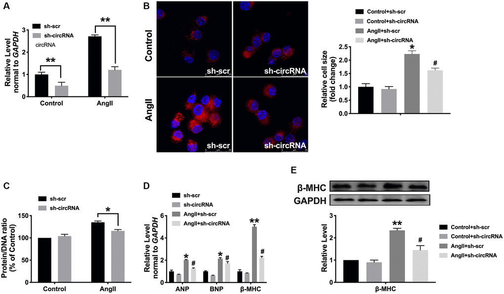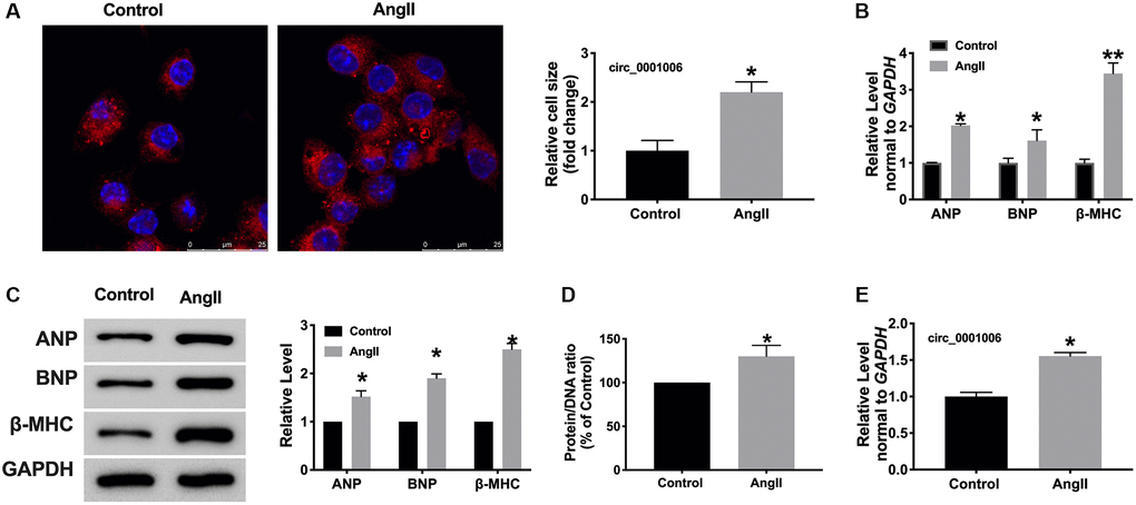 Furthermore, A vitro model was used in this research. Cardiomyocytes were treated with Ang II (200 nmol/L) for 48 hrs, both cell cross size, hypertrophic biomarkers, and protein/DNA ratio increased remarkably in Ang II-treated cells (Figure 2A–2D). Consistent with results in vivo, circ_0001006 was upregulated in cardiomyocytes treated with Ang II (Figure 2E).