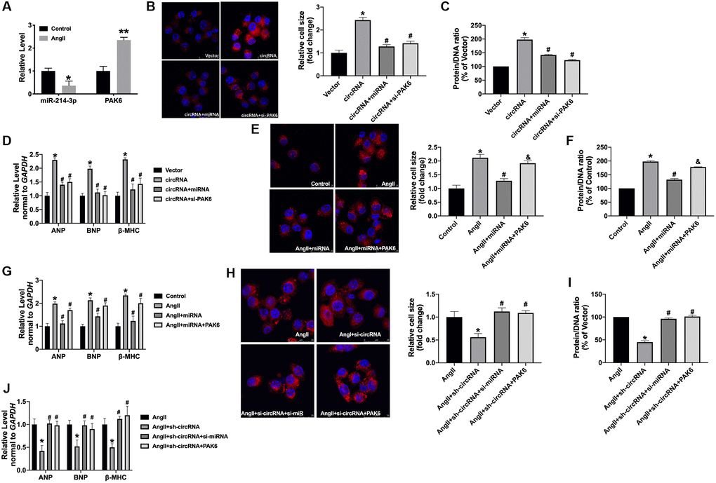 Next, we found the decreased level of miR-214-3p and increased level of PAK6 in AngII-treated cardiomyocytes (Figure 6A). Furthermore, we co-transfection circ_0001006 with miRNA-214-3p mimics or si-PAK6 in normal cardiomyocytes. The gain function of circ_0001006 increases the cell cross size and the protein/DNA ratio in Ang II-treated cardiomyocytes, which were remitted by miRNA-214-3p mimics or si-PAK6 (Figure 6B and 6C). The mRNA levels of hypertrophy biomarkers were also recovered by overexpression miRNA-214-3p or si-PAK6 (Figure 6D). Co-transfection of PAK6 abolished the function of miR-214-3p on Ang II-treated cardiomyocytes, which was performed by promoting hypertrophic markers expression (Figure 6E–6G). Meanwhile, silencing of circ_0001006 inhibited cardiomyocyte hypertrophy, which was abolished by si-miR-214-3p or PAK6 overexpression (Figure 6H–6J). Taken together, circ_0001006 regulates hypertrophy by targeting miR-214-3p/PAK6.