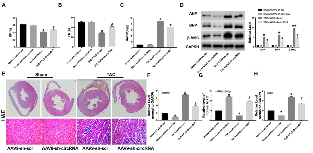 Then, AAV9 sh-circ_0001006 or AAV9 sh-Scr were injected into mice via tail vein for 21 days, and the mice have subjected to TAC surgery for creating cardiac hypertrophy model. The cardiac function was determined by echocardiography. AAV9 sh-circ_0001006 recovered the EF (%) and FS (%) in TAC mice (Figure 7A and 7B). The results showed a lower HW/BW ratio in the sh-circ_0001006 injection TAC mice (Figure 7C). The ANP, BNP, and β-MHC levels were dramatically downregulated when compared with the sh-Scr group in TAC mice (Figure 7D). H&E staining results performed that AAV9 sh-circ_0001006 prevented cardiac hypertrophy in TAC mice (Figure 7E). We performed qRT-PCR assays to verify the downregulation of circ_0001006 (Figure 7F). We also performed the change of miR-241-3p and PAK6 level was consistent with the results in vitro (Figure 7G and 7H). Together, these data suggest that circ_0001006 promoted cardiac hypertrophy via suppressing miR-214-3p targeting to PAK6.