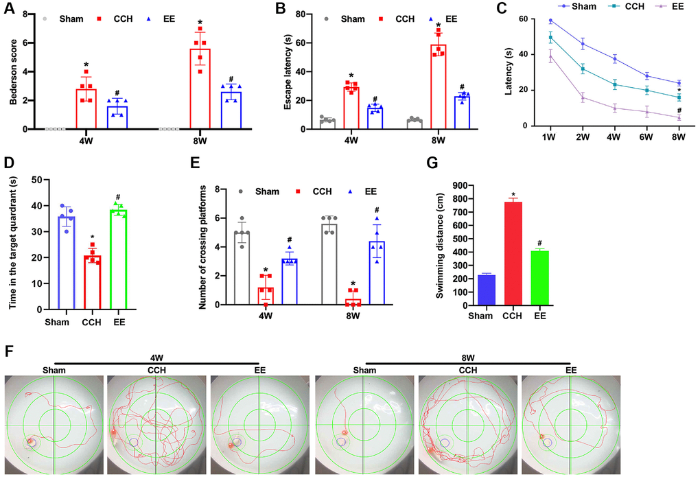 The Bederson scoring system was used to determine the neurological damage in rats. After bilateral carotid artery ligation, the neurological function scores of rats gradually increased at 4 weeks and 8 weeks, while the neurological function of rats treated with EE was significantly improved (Figure 1A). Furthermore, the learning and memory ability of rats in each group was tested by Morris water maze test. The escape latency and the crossing times of the original platform were recorded as evaluation indicators. After the rat's bilateral arteries were ligated with for 4W, the escape latency and the time in the target quadrant were extended (Figure 1B–1D) and the crossing times of the original platform were decreased (Figure 1E). After 8 weeks of ischemia, the changes in escape latency and the crossing times of the original platform of CCH rats were more obvious, And the escape latency and the crossing times of the original platform of CCH rats were changed most significantly compared to the same indicators of CCH rats at 4w. While EE could significantly improve the performance of the rats' performance of spatial memory ability (Figure 1F and 1G), and the escape latency of CCH rats were gradually shortened, the crossing time of the original platform was increased after 4w and 8w of EE stimulation, and the impairment of learning and memory functions was repaired and nerve function damage was reduced in CCH rats.