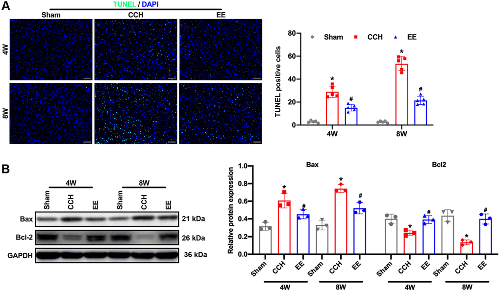 The results showed that the rats were ligated through bilateral common carotid artery for four or eight weeks, the hippocampal and frontal cortex of the rats were damaged, especially in the CCH group, Neuronal apoptosis was further observed by TUNEL staining. The results showed that the apoptosis rate of rats in the CCH group increased gradually with the extension of time, and the apoptosis rate was the highest at eight weeks (Figure 2A). However, under the enriched environment, the apoptosis rate of rats was significantly reduced, and the expression of Bax was reduced, and the expression of anti-apoptotic Bcl-2 was promoted (Figure 2B). These results demonstrated that the enriched environment could reduce the apoptosis rate of neurons in CCH rats and perform a protective role in brain injury.