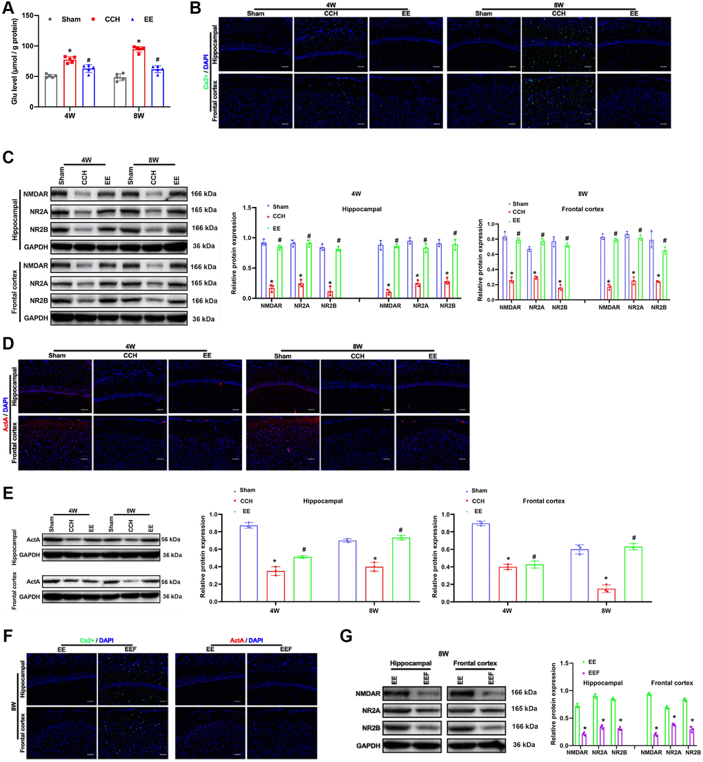 When the rats were ligated through bilateral common carotid artery for four and eight weeks, the content of Glu in the rat brain tissues increased (Figure 3A). It was found that the fluorescence intensity of Ca2+ was lower in the CCH group, while the content of calcium ions in the cerebral cortex and hippocampus of the rats in a rich environment increased (Figure 3B). It is well known that NMDAR maintains the normal physiological function of neurons by regulating the influx of calcium ions. We detected the expression of NMDAR and its subunits NR2A and NR2B, and the results showed that enriched environment could up-regulate the expression of NMDAR, NR2A and NR2B in hippocampus and cortical areas (Figure 3C). At the same time, ActA expression was activated in hippocampus and cortex (Figure 3D, 3E). In order to verify that ActA upregulation of NMDAR in rich environment can improve intracellular Ca2+, ActA blocker (FSH) was administered to the rats in the enriched environment, and results showed that the effect of enriched environment was canceled (Figure 3F, 3G).