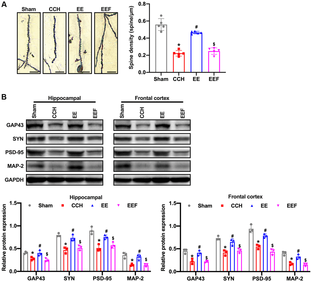 Environmental stimulation can affect the morphology and function of the brain and play an important role in brain development [5]. Mice in the EE cage performed more motor, sensory, and cognitive stimuli than those in the normal cage [24]. Non-invasive environmental stimulation participated in reducing cognitive deficits and maintaining the integrity of brain tissue in rats’ brain injury, the cause of which is related to EE's alleviation of brain tissue injury and maintenance of neuronal structure integrity [25]. It is also accompanied by a series of plasticity responses in the brain, including cell proliferation, neuronal side outlays, new synaptic connections and changes in the density of synaptic vesicles, and changes in the plasticity-related proteins. Engineer et al. [26] confirmed that the number of primary auditory cortex (A1) neurons increased for two weeks after receiving EE stimulation in sexually mature rats. As EE stimulation and SE stimulation were given to the two groups of 21-week old cerebral ischemia rats respectively for 2 months, there were significant differences in the number of neurons in hippocampal CA1 region between the two groups, suggesting that EE has a protective effect on hippocampal pyramidal cells [27–29]. EE can increase the synaptic density in the cortex of rats with acute focal cerebral ischemia and induce the changes in the synaptic structure of the cortex and hippocampus. For transient focal cerebral ischemia rats, EE can also increase the neurogenesis of the dentate gyrus in the hippocampus and eventually reverse the cognitive impairment [28]. EE can reverse the cognitive impairment caused by acute or transient ischemic encephalopathy, however, the effect of EE on the cognitive impairment caused by CCH and its mechanism is still unclear. Therefore, this study is to explore the effects of EE on cognitive impairment and synaptic plasticity caused by CCH.