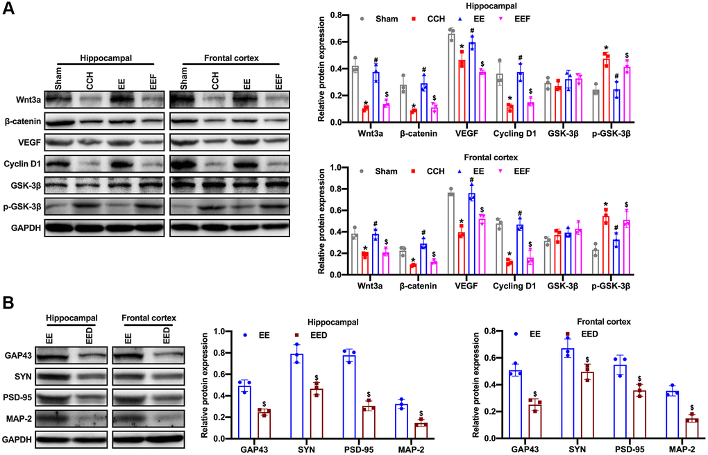 The brain tissue (N = 3) was homogenized, centrifuged at 12000 rpm at 4°C for 15 min. The supernatant was extracted and the protein concentration was examined by BCA method. The protein samples were loaded into SDS-PAGE electrophoresis, and transferred to PVDF membrane. The membrane was blocked in skim milk overnight. Then the primary antibodies including GAP-43(1:1000), SYN(1:1000), PSD-95(1:1000), MAP-2(1:1000), NMDAR(1:1000), NR2A(1:1000), NR2B(1:1000), BCL2(1:1000), BAX(1:1000), Wnt3a(1:1000), β-catenin(1:1000), VEGF(1:1000), CyclinD1(1:1000), GAPDH(1:1000) were incubated separately for 1 h. Following with that, the secondary antibody was added and incubated for 1 h. After ECL luminescence kit for visualization, the Image J software was performed for gray value analysis. primary antibodies purchased from Proteintech Biotechnology.
