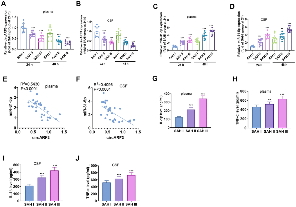 RT-PCR was performed to evaluate circARF3 and miR-31-5p alterations in the serum and CSF of SAH patients. The results revealed that circARF3 expression decreased significantly in plasma in SAH patients at Fisher stage II and III compared with that in SAH patients at Fisher stage I (Figure 1A, 1B). Meanwhile, miR-31-5p levels were significantly increased in plasma of SAH patients at Fisher stage II and III compared with that in SAH patients at Fisher stage I (Figure 1C, 1D). Among the SAH patients, the Pearson linear regression analysis showed that circARF3 was reversely correlated with miR-31-5p in plasma and CSF of SAH patients (Figure 1E, 1F). Further, the levels of IL-1β and TNF-α in plasma and CSF samples were analyzed by ELISA. As a result, their levels were significantly higher in the plasma of SAH patients with higher Fisher stages (Figure 1G–1J), and their level reached the highest level in the SAH patients at Fisher III stage (Figure 1G–1J). These results suggested that both circARF3 and miR-31-5p were involved in SAH-induced inflammation.