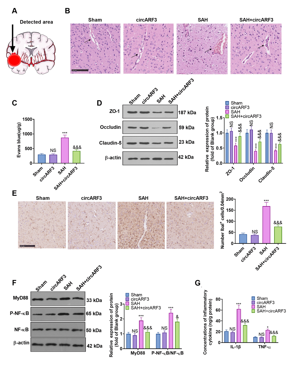 We tested the integrity of BBB with HE staining and Evans’ blue to further explore the protective mechanism of circARF3 in attenuating brain injury in SAH rats. The detected area was shown in Figure 3A. The results confirmed that after SAH, the integrity of BMECs in injury lesions was destroyed, and a large number of blood cells exuded from brain tissues (Figure 3B). Meanwhile, the permeability of Evans blue in brain tissue was significantly increased (Figure 3C). Next, the expression of tight junction proteins (ZO-1, Occludin, and Claudin-5) in endothelial cells was compared by WB. The results confirmed that their levels in the SAH group were lower than those of the rats in sham group and were dramatically facilitated after overexpressing circARF3 (vs. the SAH group, Figure 3D). We then assessed the microglial/macrophage activation and inflammation in brain injury lesions. It turned out that SAH induced microglial/macrophage activation (Figure 3E), accompanied by the activation of MyD88-NF-κB (Figure 3F) and up-regulation of IL-1β and TNF-α (Figure 3G). In contrast, after circARF3 overexpression, the above reactions were significantly weakened (Figure 3E–3G). Thus, circARF3 exerted a neuroprotective role by attenuating BBB destruction and microglia-mediated inflammation.