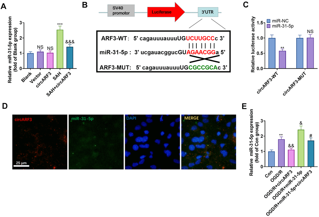 MicroRNAs (miRNAs) are a class of endogenous non-coding small RNAs with a length of 18~25 nucleotides. They regulate protein expression through the messenger RNA of protein-coding genes via translational inhibition or transcriptional substitution, thus playing an extensive role in cell biological functions [20]. Emerging studies have shown that miRNAs affect stroke-induced neuroinflammation [21], VEC injury [22] and neuronal apoptosis [23] by regulating microglial activation. It is noteworthy that miR-31-5p can not only directly regulate the proliferation, migration and invasion of tumor cells as a biomarker for tumor diagnosis [24], but also modulate the angiogenesis of VECs [25]. What’s more, miR-31-5p mediates endothelial dysfunction by regulating the endothelial nitric-oxide synthase, and the NF-κB activation directly leads to the up-regulation of miR-31-5p [26]. On the other hand, circRNA functions as a miRNA sponge and interacts with miR-31-5p, which targets its downstream gene and affects Renal Cell Carcinoma progression [27]. Therefore, we focused on the potential regulatory axis of circARF3/miR-31-5p in SAH.