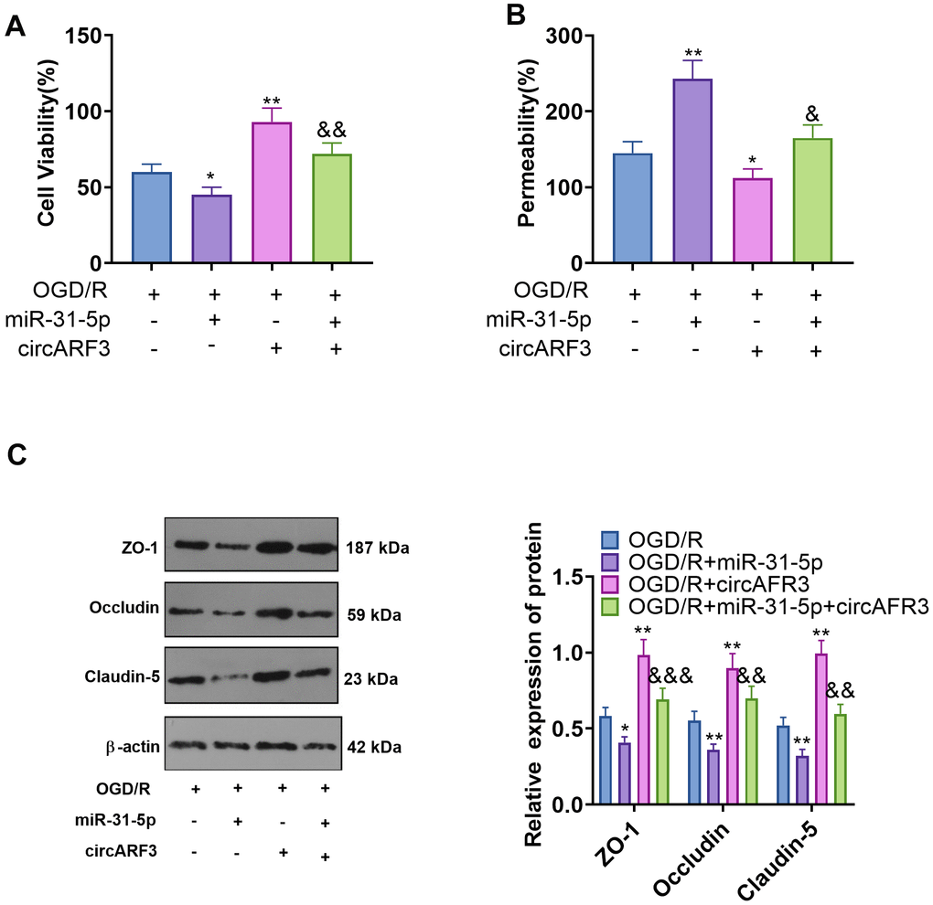 BMECs were isolated from new-born SD rats and identified by cellular immunofluorescence (labeled by vWF) (Supplementary Figure 2A). Then BMECs were transfected with miR-31-5p mimics and/or circARF3 overexpression plasmids were treated with OGD/R. First, we tested the viability of BMECs by the CCK8 experiment. The results confirmed that compared with the OGD/R group, cell viability decreased in the OGD/R+miR-31-5p group and increased in the OGD/R+circAFR3 group. In contrast, the cell viability of the OGD/R+miR-31-5p+circAFR3 group was higher than that of the OGD-R+miR-31-5p group (Figure 5A). Next, we employed the BMEC permeability experiment and found that miR-31-5p significantly strengthened the permeability of BMECs, while overexpressing circARF3 dampened the OGD/R-mediated increase of BMEC permeability and greatly attenuated the miR-31-5p-mediated effect (Figure 5B). In addition, the levels of ZO-1, Occludin and Claudin-5 were examined by WB. As a result, their expression was hampered by miR-31-5p while it was enhanced by circARF3 (Figure 5C). Meanwhile, circARF3 reversed the effect of miR-31-5p (Figure 5C). Thus, the up-regulation of miR-31-5p aggravated the OGD/R-mediated BMEC injury, and circARF3 could largely weaken the miR-31-5p-mediated effect.