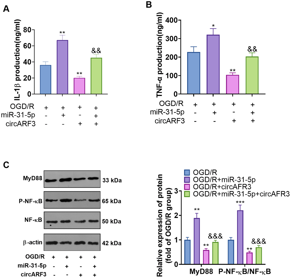 Primary microglia were isolated from new-born SD rats and identified by cellular immunofluorescence (labeled by CD11b) (Supplementary Figure 2B). We determined the levels of inflammatory cytokines IL-1β and TNF-α in the medium supernatant to further probe the regulation of circARF3/miR-31-5p on microglial inflammation. As a result, compared with the OGD-R group, the levels of IL-1β and TNF-α in the OGD-R+miR-31-5p group were significantly boosted, while their levels were notably diminished in the OGD-R+circAFR3 group (Figure 6A, 6B). Besides, circAFR3 attenuated miR-31-5p up-regulation-mediated increase in IL-1β and TNF-α (Figure 6A, 6B). Moreover, the MyD88-NF-κB pathway activation in microglia was determined by WB. It turned out that compared with the OGD/R group, the phosphorylation levels of MyD88 and NF-κB were significantly heightened in the OGD-R+miR-31-5p group and dampened in the OGD-R+circAFR3 group (Figure 6C). Interestingly, their phosphorylation levels were lower in the OGD/R+ miR-31-5p +circAFR3 group than that in the OGD/R+miR-31-5p group (Figure 6C). These results illustrated that circARF3 weakened the miR-31-5p-mediated pro-inflammatory effects via repressing MyD88/NF-κB pathway (Figure 7).
