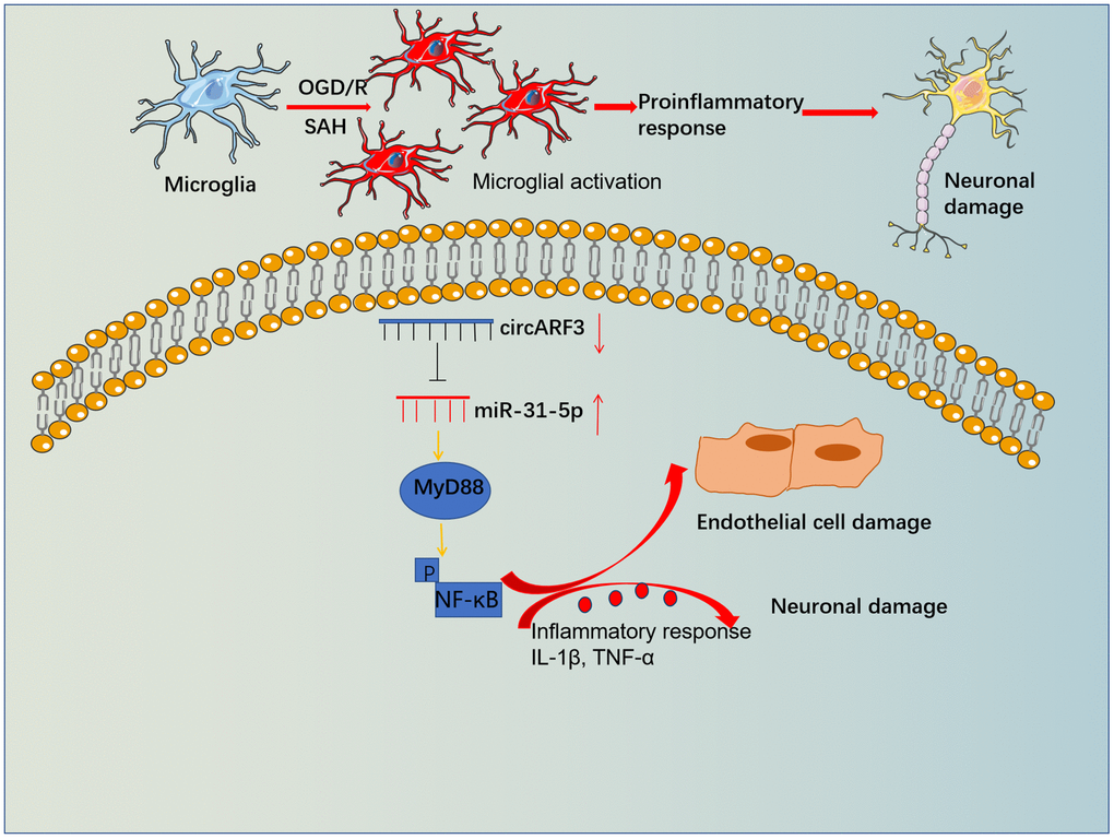 Toll-like receptor 4 (TLR4) is a pattern recognition receptor and contributes to inflammatory responses mediated by microglia, neurons, astrocytes, endothelial cells, etc. [53]. After being activated by its ligand, TLR4 can activate NF-κB through a MyD88-dependent pathway, which produces TNF-α and IL-1β [54]. In this study, we observed that SAH promoted the MyD88-NF-κB pathway activation, while overexpressing circARF3 attenuated the pathological changes both in vivo and in vitro. Conversely, the up-regulation of miR-31-5p activated MyD88-NF-κB, and this effect was rescued by circARF3 overexpression. Interestingly, previous studies have reported that miR-31-5p is up-regulated after NF-κB pathway activation and exacerbates the inflammatory response [26], while pro-inflammatory factors such as IL-6 or TNF-α contribute to the up-regulation of miR-31-5p [55]. These findings suggest that miR-31-5p may form a positive feedback loop with the MyD88-NF-κB pathway. Therefore, we hypothesized that circARF3 could improve the secondary brain injury after SAH by downregulating the miR-31-5p-MyD88-NF-κB pathway.