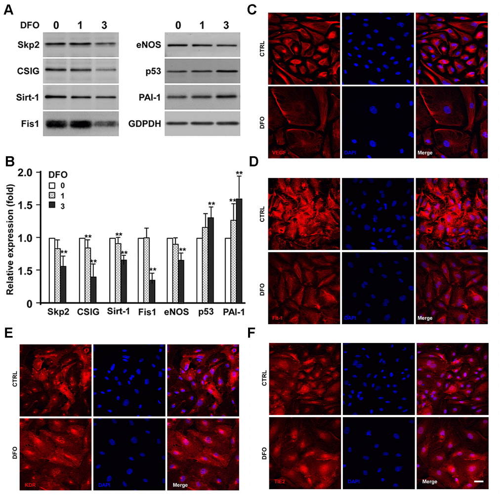As DFO increased the percentage of SA- βGal activity-positive cells and induced senescence-like G1 arrest, we next examined whether DFO induced a senescent protein expression pattern in EPCs. Four-day DFO treatment (at 0, 1 and 3 μM) dose-dependently reduced the expression of anti-senescence-related proteins such as S phase kinase-associated protein-2 (Skp2), cell senescence-inhibited gene (CSIG), sirtuin 1 (Sirt1) and mitochondrial fission 1 protein (Fis-1) (Figure 3A, 3B). More importantly, plasminogen activator inhibitor-1 (PAI-1) and p53 were significantly upregulated, while endothelial nitric oxide synthase (eNOS) was downregulated (Figure 3A, 3B). The DFO-altered protein expression patterns in the current study are highly mimicking the phenotypes induced by repeat replication as described [14–16].