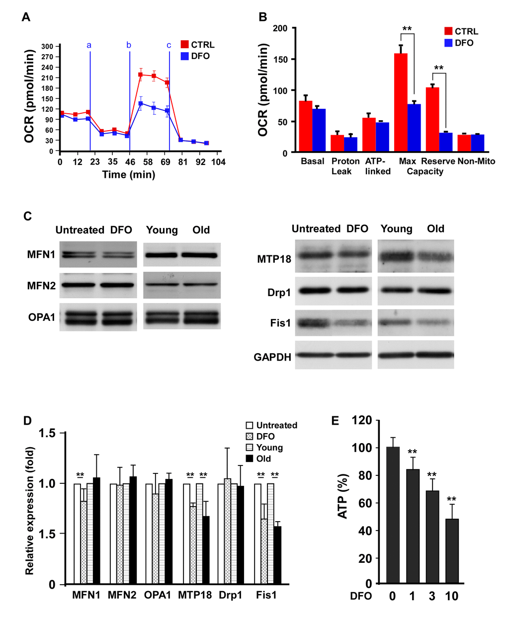 A previous report indicated that DFO treatment progressively reduced mitochondrial complex II and IV activity [19]. Accordingly, we examined the effects of DFO on mitochondrial respiratory efficiency in EPCs. The oxygen consumption rate (OCR) curve moved markedly downward in the DFO-treated group (Figure 4A), in a pattern highly resembling that of EPCs isolated from old animals [14]. Among the quantified respiratory parameters, the mitochondrial reserve capacity and the maximal respiratory capacity of the EPCs were significantly reduced upon DFO treatment (Figure 4B), indicating that DFO reduced the respiratory efficiency. Consistent with this finding, DFO diminished the adenosine triphosphate (ATP) production rate in EPCs (Figure 4E).