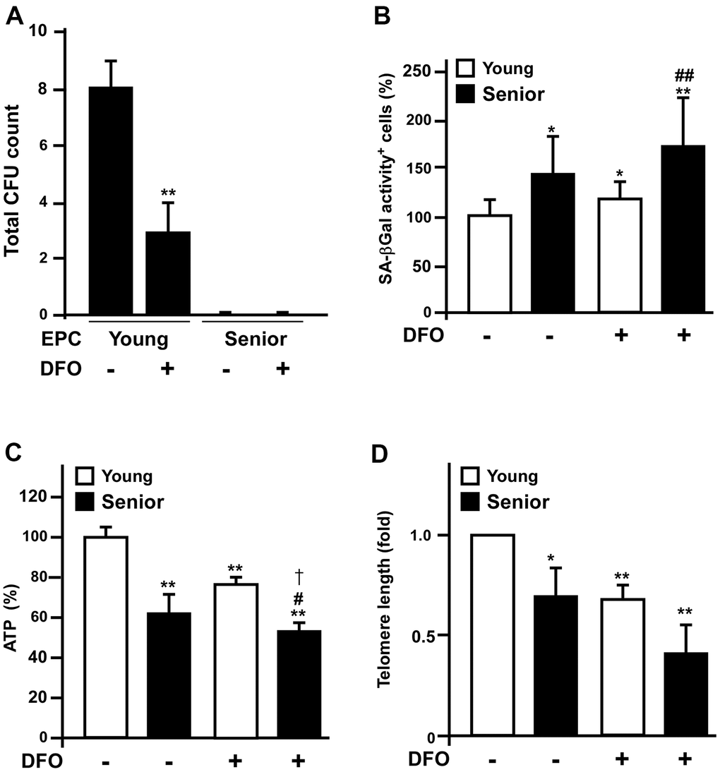 To evaluate whether ex vivo DFO treatment could mimic in vivo senescence, we harvested early EPCs from young (< 35 year-old) and senior (> 70 year-old) donors, and treated them with or without 3 μM DFO. We then assessed the colony-forming potential of the early EPCs, which is critical for their angiogenic activity. After seven days of culture, DFO dramatically reduced the colony-forming potential of early EPCs isolated from young donors; however, its effects on senior donors’ EPCs were blunted, as the colony-forming unit (CFU) counts of these cells were already low before DFO treatment (Figure 5A). However, compared to untreated groups, DFO is able to accelerate EPCs to develop other senescent phenotypes such as increased SA-βGal activity, reduced ATP production and diminished telomere lengths both in young and senior groups (Figure 5B–5D).