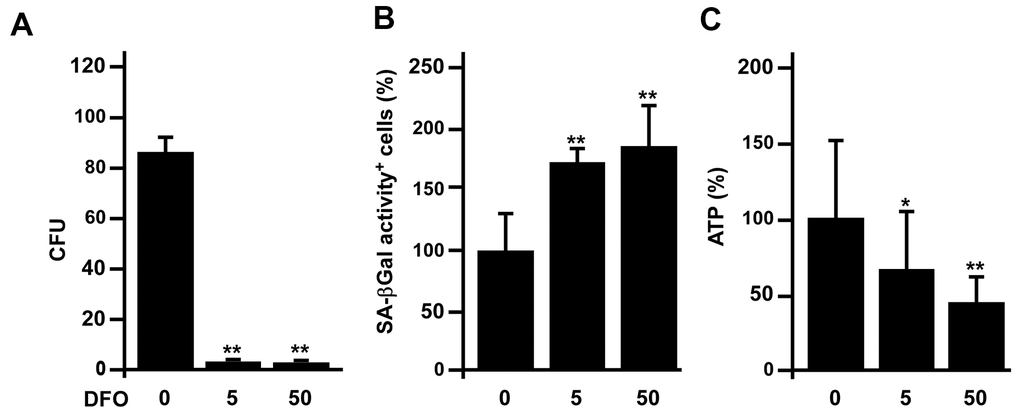 We also examined whether DFO could accelerate EPC senescence in vivo. Three-month-old Sprague-Dawley rats were administered DFO (0, 5 or 50 mg/kg/day) intraperitoneally for four weeks, and early EPCs were isolated from the rats for various assays. The results indicated that DFO pronouncedly reduced the colony formation (CFU count), increased the SA-βGal activity and reduced the ATP production of these cells (Figure 6A–6C).