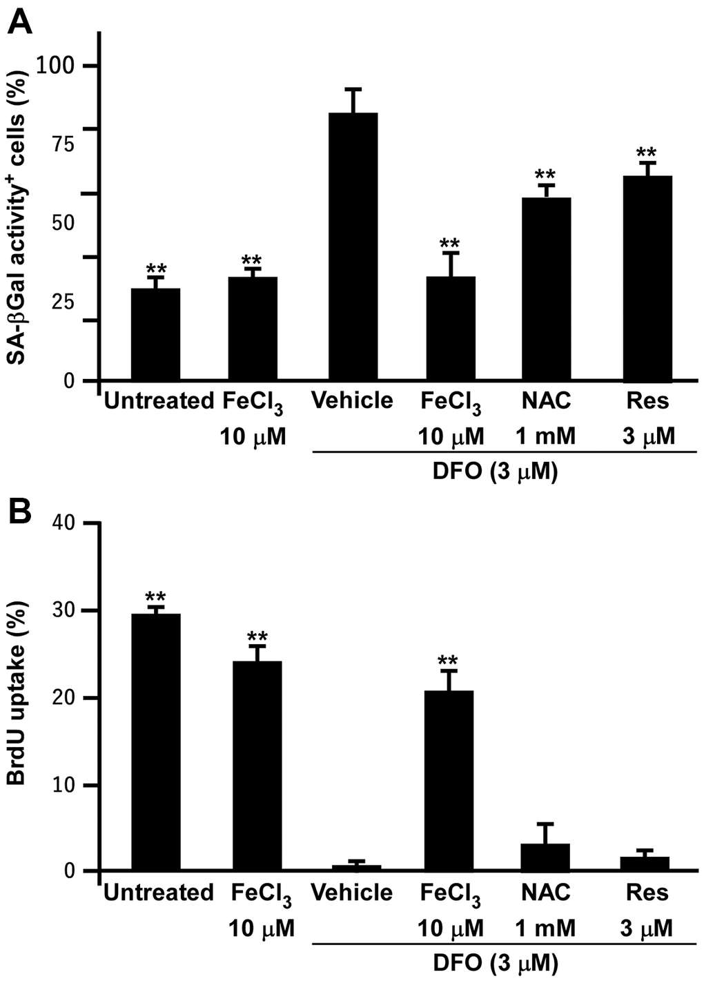 As DFO induced senescence in EPCs and various cell lines, we tested whether the antioxidants N-acetylcysteine and resveratrol could prevent DFO-induced EPC senescence, using FeCl3 as a positive control. As expected, FeCl3 almost completely reversed the induction of senescence and the inhibition of proliferation in DFO-treated EPCs (Figure 7), indicating that this senescence model is iron-sensitive. However, both antioxidants only partially rescued the DFO-induced senescent phenotypes and failed to restore cell proliferation.