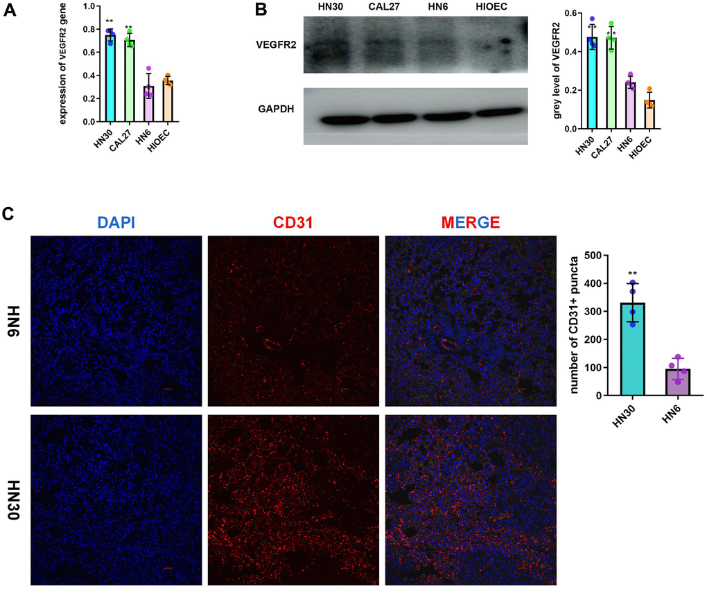 According to the analysis of the TGCA-HNSC dataset, VEGFR2 (also known as KDR) expression was increased in cancer tissue compared with that in normal tissue. (Supplementary Figure 1A). Compared with that of the patients with low VEGFR2 expression, the survival time of patients with high VEGFR2 expression was shorter (Supplementary Figure 1B). According to the qRT-PCR and western blotting results, HNSCC cells had higher VEGFR2 levels than HIOECs. VEGFR2 expression was lower in HN6 cells than in HN30 and CAL27 cells (Figure 1A, 1B). In accordance with the in vitro results, subcutaneous tumors formed by HN30 showed a greater degree of angiogenesis than of those formed by HN6 cells (Figure 1C).