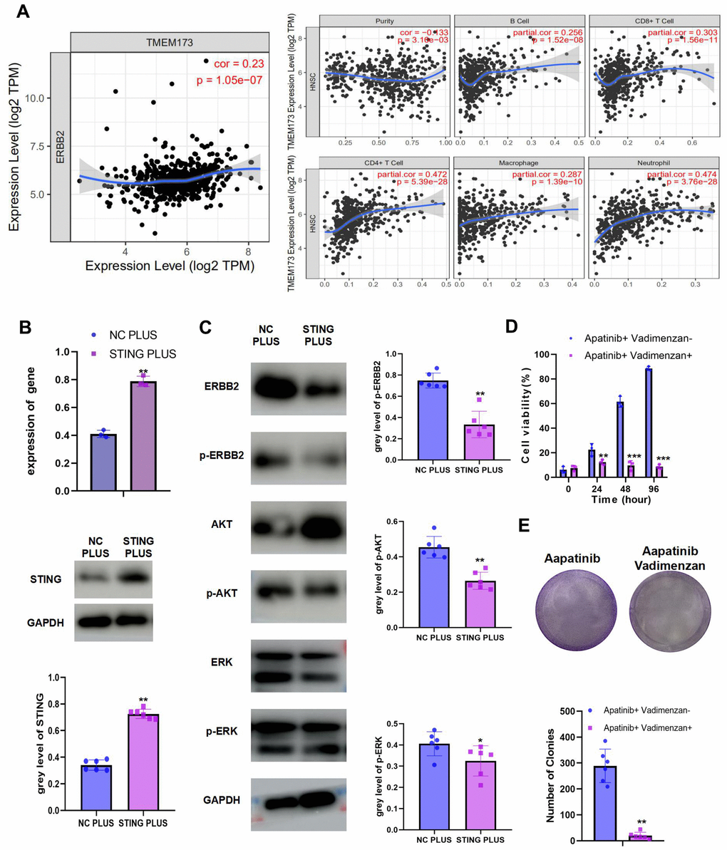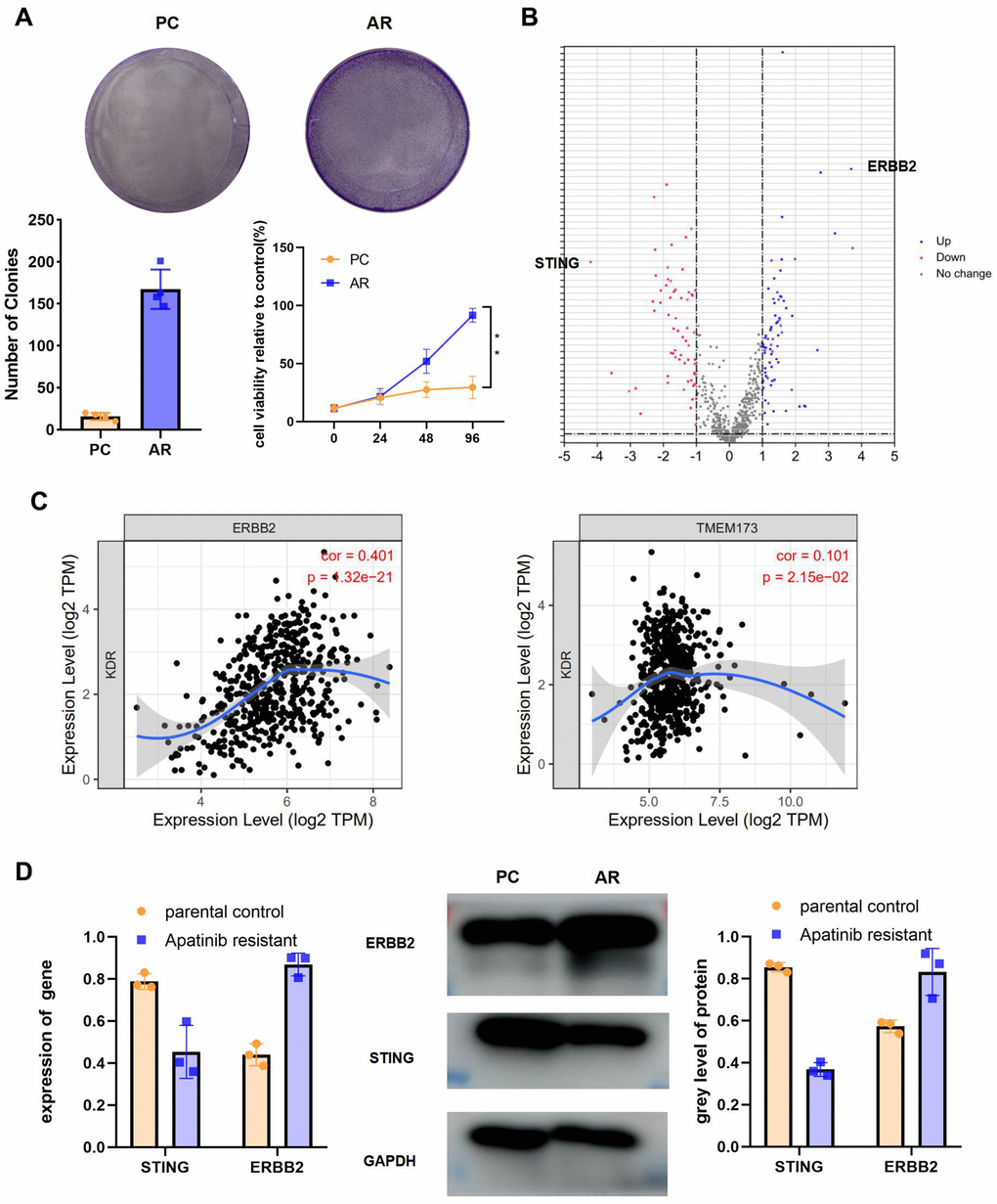The colony formation assay and CCK-8 results for the AR cells compared with the PC cells showed that proliferation occurred in a fold-change manner (Figure 2A). (**P < 0.01). The viability of the AR cells higher than that of the PC controls. To analyze the signaling pathways related to apatinib resistance, RNA seq of AR and PC cells was performed. A total of 198 downregulated and 277 upregulation mRNAs were obtained for differential analysis (Figure 2B). STING and ERBB2 showed the highest fold change. To evaluate the relationship between VEGFR2, STING, and ERBB2, the TIMER database was used (http://timer.cistrome.org/), which identified a negative correlation between VEGFR2 and STING (also known as TMEM173) (Figure 2C). Meanwhile, a positive correlation was confirmed between VEGFR2 and ERBB2 (Figure 2C). In accordance with bioinformatic results, qRT-PCR and western blotting results showed upregulation of ERBB2 levels and downregulation of STING levels in AR cells compared with those in PC cells (Figure 2D).