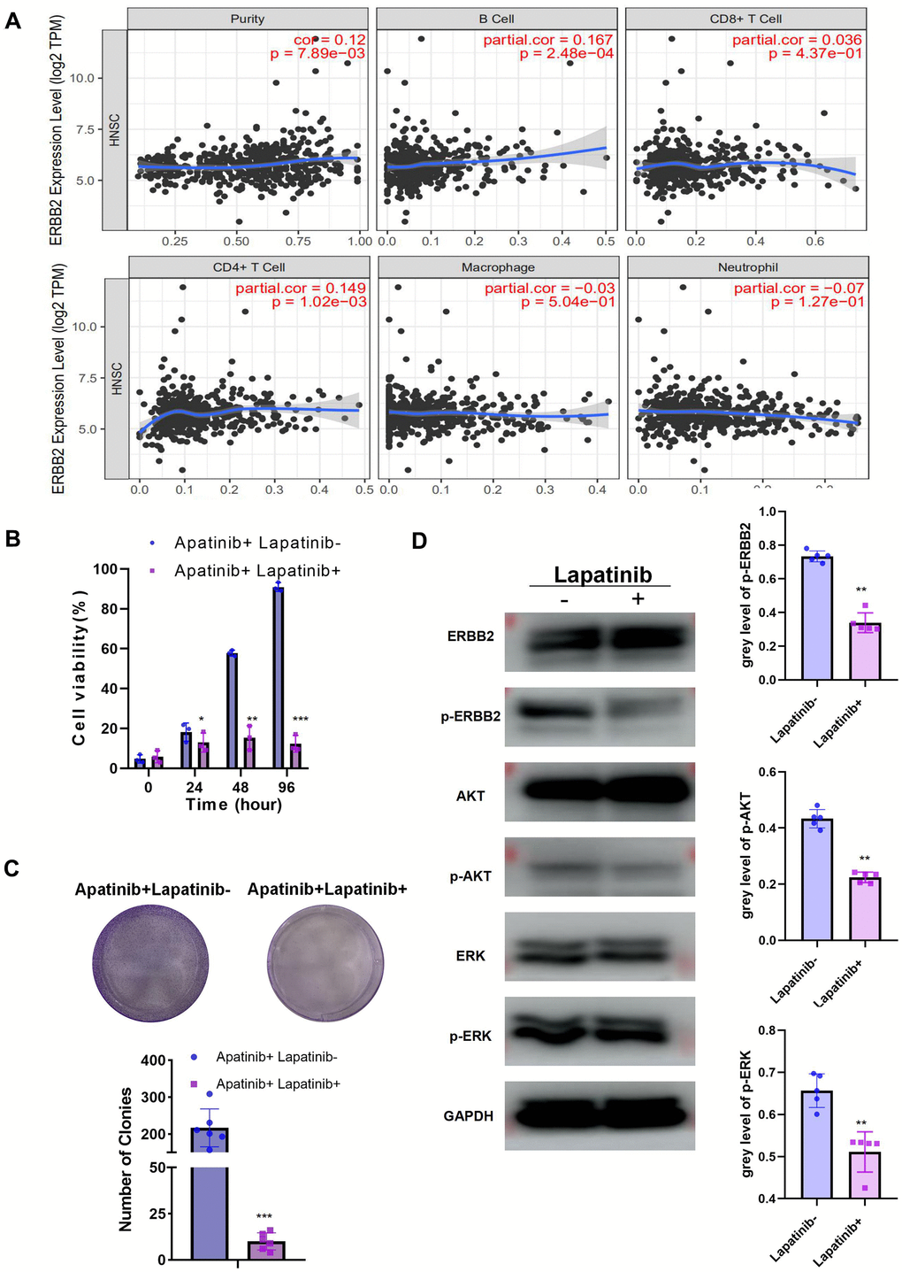 To further explore the function of ERBB2 in apatinib resistance, TIMER analysis was used, which revealed the negative correlation between ERBB2 and immune cell infiltration (Figure 3A). This led us to speculate that apatinib combined with an ERBB2 inhibitor might increase apatinib sensitivity effectively. Lapatinib is an FDA approved ERBB2 inhibitor. According to a previous report [13], phosphorylation of ERBB2 is greatly downregulated by lapatinib. To address the efficacy of ERBB2 inhibition in apatinib resistance, AR cells were treated with lapatinib combined with apatinib. The results showed that the combined treatment suppressed AR cell proliferation in a synergistic manner (Figure 3B, 3C). Lapatinib has been reported to inhibit the growth of cancer via the ERBB2/AKT/mTOR [14] and RAF/MEK/ERK [15, 16] signaling pathways. The western blotting results showed that levels of p-ERBB, p-ERK, and p-AKT in AR cells decreased after 24 h of treatment with apatinib and lapatinib (Figure 3D). The amount of total AKT or ERBB2 protein in AR cells did not change after treatment.