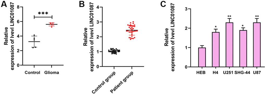 By analyzing the LINC01087 expression in GSE103229 expression profiling, we found that the expression in glioma increased dramatically (Figure 1A). qRT-PCR also manifested that the expression in glioma patients was obviously higher than that in the CG (Figure 1B). In addition, by detecting the expression in glioma cell lines, we also discovered that the LINC01087 relative level in U87, SHG-44, U251 and H4 cells increased markedly (Figure 1C). This suggested that it might be involved in the development of glioma.