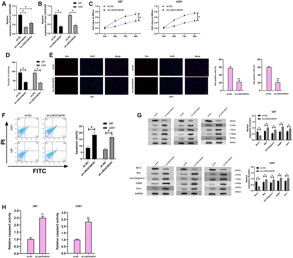 To further understand the role of LINC01087 in glioma, we established sh-LINC01087 plasmid and transfected sh-LINC01087#1 into U87 and U251 cells (Figure 2A, 2B). Cell growth and apoptosis were tested via CCK-8, cloning experiment, flow cytometry and WB experiment. CCK-8, colony formation, and Edu assays manifested that cell viability, cloning, and proliferation were markedly suppressed after transfection of sh-LINC01087#1 (Figure 2C–2E), while flow cytometry manifested that this induced apoptosis (Figure 2F). Moreover, WB experiments showed that the expression of Bax, cle-Caspase-3, PARP and cyt-c protein after transfection was obviously higher than that of sh-NC group, while the Bcl-2 protein expression was dramatically lower (Figure 2G). Meanwhile, the depletion of LINC01087 by sh-LINC01087#1 enhanced the relative caspase-3 activity in the glioma cells (Figure 2H). It indicated that inhibiting LINC01087 could induce apoptosis and reduce glioma cell proliferation.