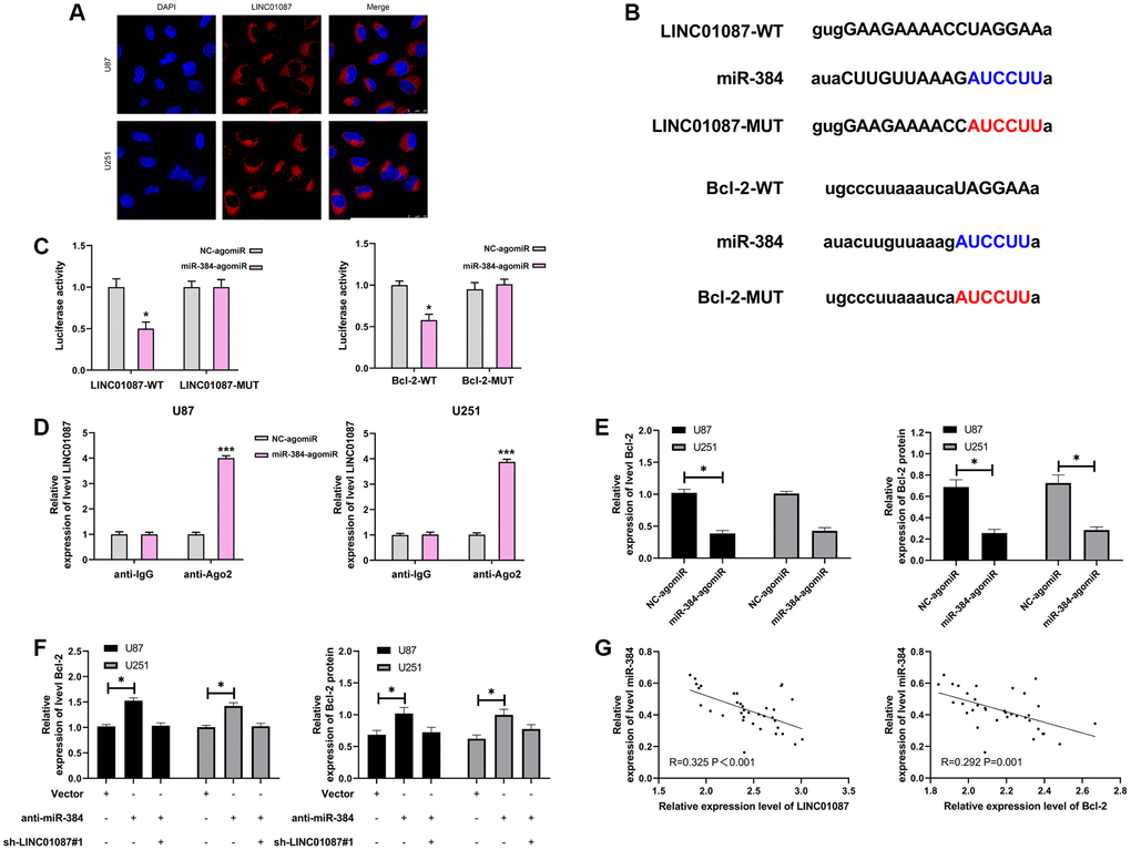 LncRNA has been proved to be miRNA sponge in tumor cells. To study whether LINC01087 could regulate miR, we first determined its localization in glioma cells by fluorescence in situ hybridization (Figure 3A). After that, we found that LINC01087 was primarily situated in the cytoplasm of glioma cells. Then, we predicted that there was a potential binding site between miR-384 and LINC01087 through starBase website. To prove this, we verified it by RIP and dual-luciferase report experiment (Figure 3B). It manifested that miR-384-agomiR could effectively inhibit the fluorescence activity of LINC01087-WT (Figure 3C), while RIP analysis found that both LINC01087 and miR-384 were enriched by anti-Ago2 in glioma cell lysate. LINC01087 could regulate miR-384 (Figure 3D), and it’s worth noting that the expression of miR-384 increased markedly after LINC01087 was knocked down. To further understand the mechanism of LINC01087/miR-384 axis, we predicted the potential mRNA downstream of miR-384. There was a targeted binding site between miR-384 and Bcl-2 through starBase and TargetScan prediction. For further verification, we conducted a dual-luciferase report. The results indicated that the fluorescence activity of Bcl-2-WT could be inhibited by miR-384-agomiR, and the Bcl-2 mRNA and protein expression in glioma cells transfected with miR-384-agomiR was obviously inhibited (Figure 3E, 3F). To determine whether Bcl-2 was regulated by LINC01087/miR-384 axis, we co-transfected sh-LINC01087#1 and anti-miR-384, respectively. In the end, we found that anti-miR-384 alone up-regulated Bcl-2 mRNA and protein expression. However, after co-transfection of sh-LINC01087#1 and anti-miR-384, there was no marked difference in Bcl-2 mRNA and protein expression compared with Vector, which was observed by qRT- PCR and Western blot analysis. Furthermore, through correlation analysis, we found that miR-384 was negatively correlated with LINC01087 and Bcl-2 expression in tumor tissues of glioma patients (Figure 3G). These studies suggested that LINC01087 could regulate miR-384/Bcl-2 axis.