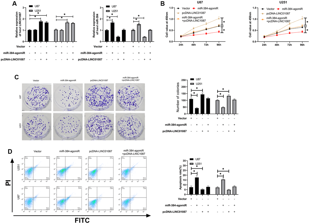 In the above study, we have confirmed that LINC01087 can regulate miR-384/Bcl-2 axis, but it's vague whether it is involved in glioma growth. Hence, we conducted a rescue experiment. First of all, qRT-PCR detection found that up-regulating miR-384 had no effect on LINC01087, but pcDNA-LINC01087 could inhibit the over-expression of miR-384 after transfection of miR-384-agomiR (Figure 4A). Afterward, we found that the proliferation and cloning of cells were obviously enhanced and the apoptosis rate decreased after transfection of pcDNA-LINC01087 alone, while the proliferation and cloning were obviously inhibited after transfection of miR-384-agomiR alone, which induced apoptosis (Figure 4B–4D). However, after co-transfection of pcDNA-LINC01087 and miR-384-agomiR, they were proliferated and cloned. This suggested that LINC01087 could take part in glioma growth through miR-384/Bcl-2 axis (*P < 0.05).