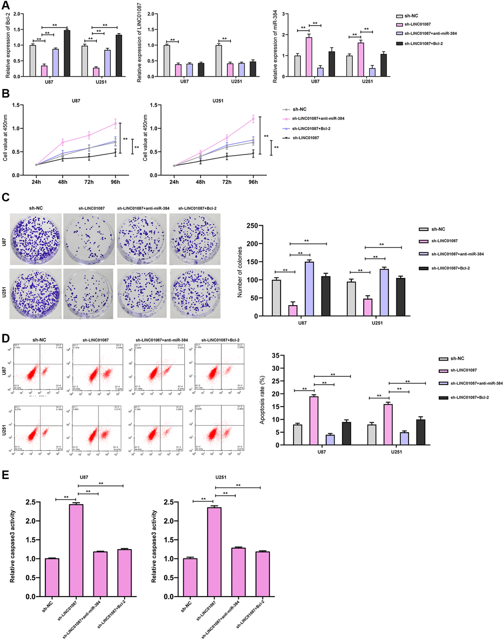 Moreover, we validated the expression of Bcl-2, LINC01087, and miR-384 in the glioma cells transfected with shLINC01087 or co-transfected with shLINC01087 and anti-miR-384 or pcDNA-Bcl-2 (Figure 5A). The cell viability and colony formation numbers were repressed and cell apoptosis and caspase-3 activity were induced by the depletion of LINC01087, while the inhibition of miR-384 or the overexpression of Bcl-2 could reverse the effect in the cells (Figure 5B–5E).