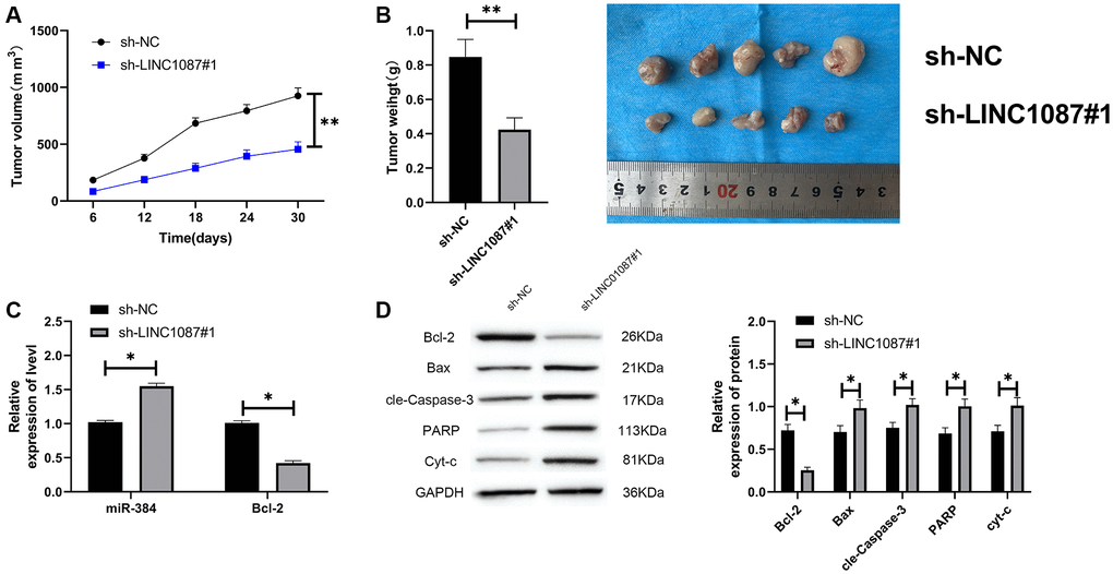 At the end of the study, we verified LINC01087’s effect in vivo. We built a xenograft tumor model and injected the glioma cells transfected with sh-LINC01087#1 into nude mice subcutaneously. We found that the tumor volume and quality of sh-LINC01087#1 group were markedly inhibited (Figure 6A, 6B), the miR-384 expression in tumor tissues increased markedly, while the Bcl-2 expression was obviously inhibited (Figure 6C). In addition, Western blot analysis showed that the expression of pro-apoptosis related proteins in tumor tissues of nude mice in sh-LINC01087#1 group increased markedly, while the Bcl-2 expression decreased dramatically (Figure 6D). It suggested that LINC01087 could suppress the growth of glioma by regulating miR-384/Bcl-2 axis.