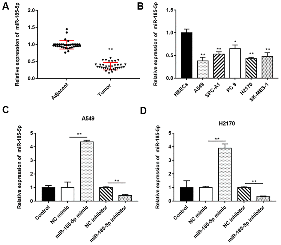 We extracted total RNA and performed RT-qPCR on 35 pairs of NSCLC tumor tissues and adjacent tissues, and the results indicated that miR-185-5p expression was decreased in lung cancer tissues compared with adjacent tissues (Figure 1A). Similarly, miR-185-5p expression was decreased in NSCLC cells (A549, SPC-A1, PC 9, H2170 and SK-MES-1) compared with HBECs (Figure 1B).